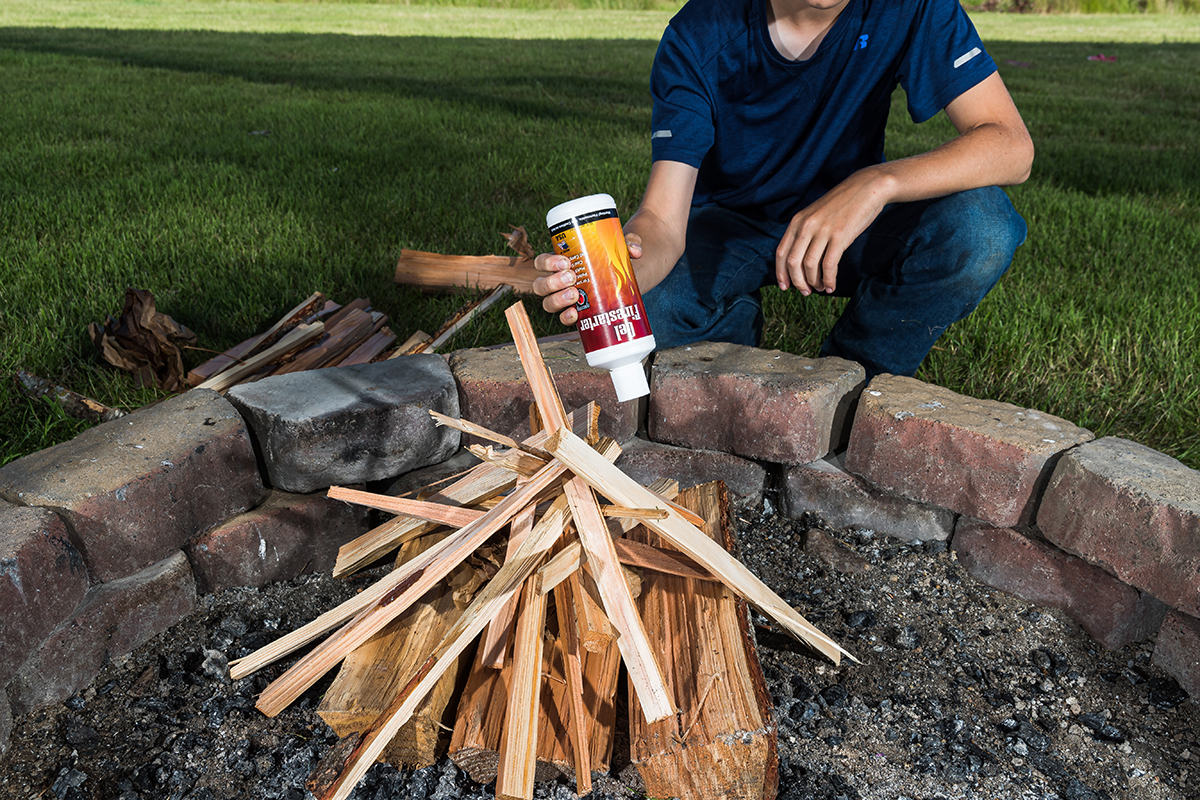 To build a pyramid, simply use unlit kindling to start the base and then pile sticks around that base in the shape of a pyramid. Once it goes going, you just add more wood. We used Firestarter gel to make lighting it quick and easy.