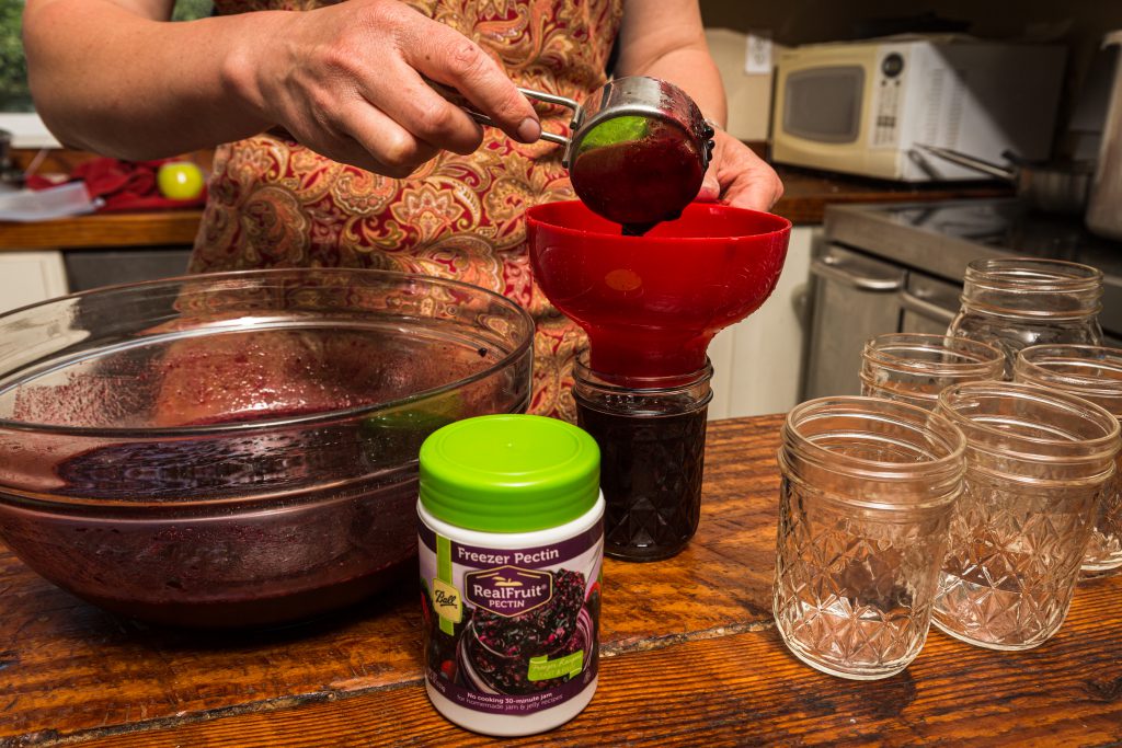 This recipe works with almost all other berries and fills two 8-ounce half-pint jars. Peaches have their own, unique recipe. Be sure and multiply the recipe to utilize all of your berries and fill the necessary number of jars.
