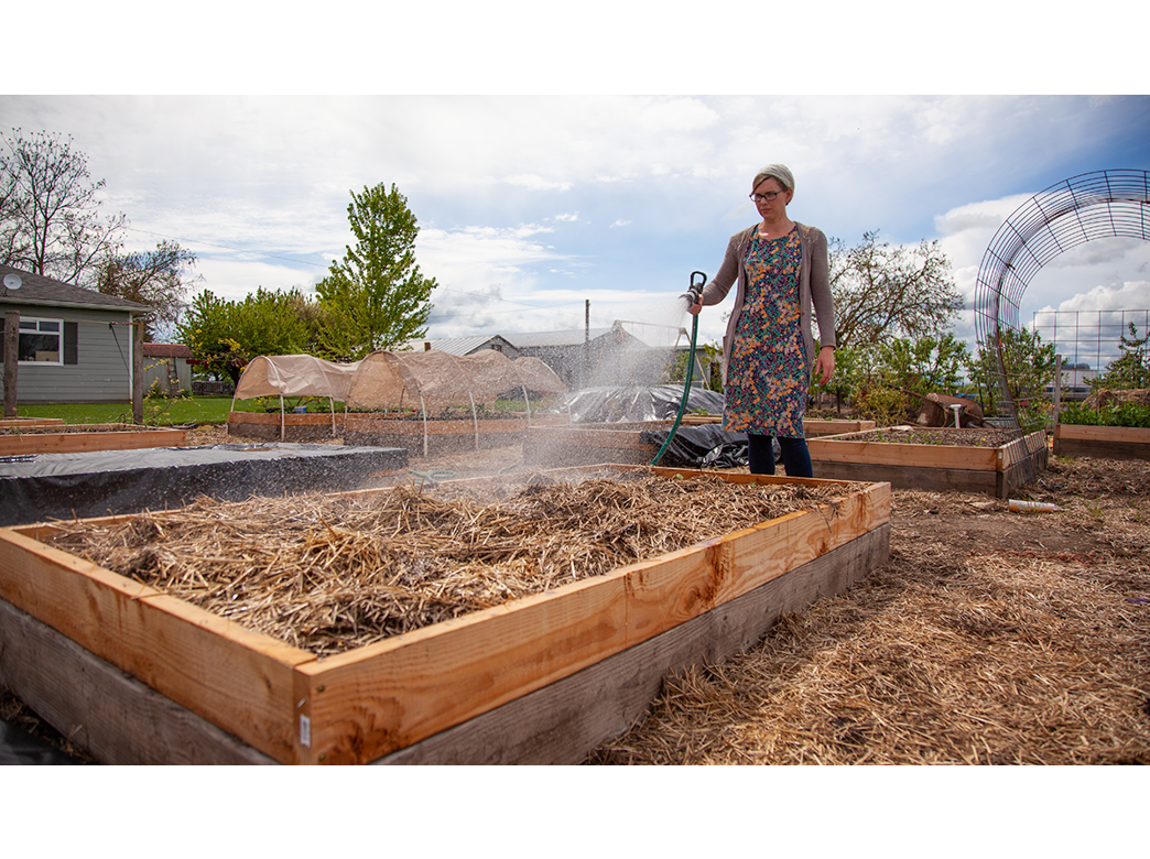 If you started seeds a month or so back, now is the time to plant them. You can also pick up your starts at Coastal. Greta is planting tomatoes, peppers, ambrosia, and watermelon.